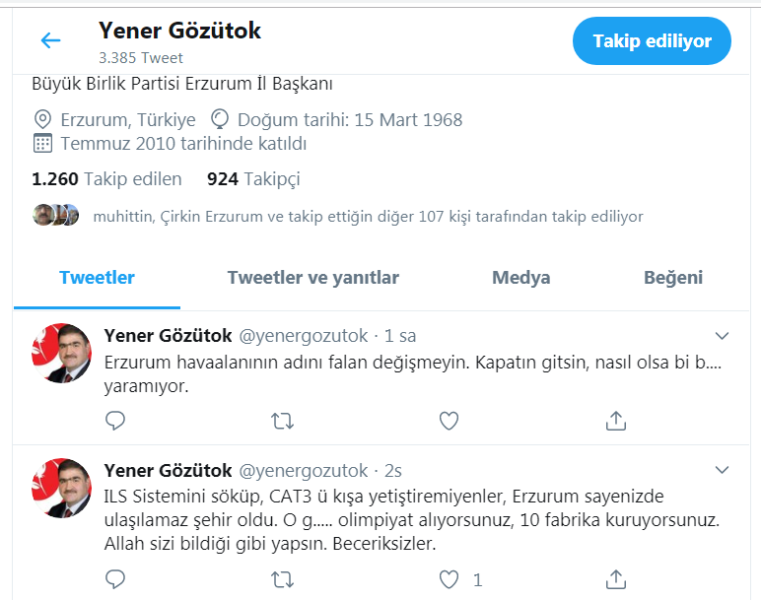 “ILS Sistemini söküp, CAT3 ü kışa yetiştiremiyenler, Erzurum sayenizde ulaşılamaz şehir oldu. O g….. olimpiyat alıyorsunuz, 10 fabrika kuruyorsunuz. Allah sizi bildiği gibi yapsın. Beceriksizler.”