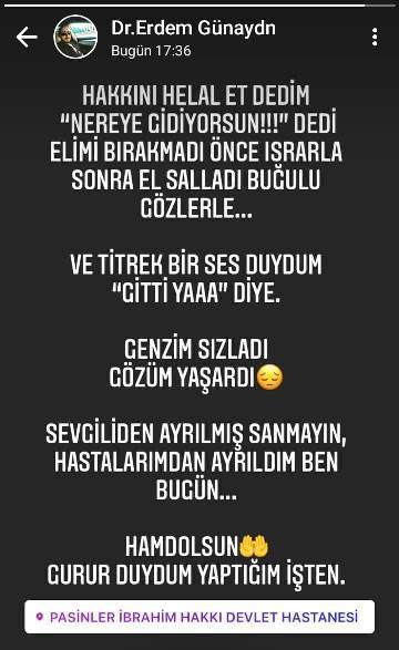 Yaklaşık beş yıldan beri Pasinler İbrahim Hakkı Devlet Hastanesi’nde görev yapan genç ve başarılı hekim Dr.Erdem Günaydın, ilçe haklı tarafından çok seviliyordu. Pandemi sürecinde yoğun bakım ünitesinde görev yapan Dr.Günaydın, özverili çalışması ve hastaları ile kurduğu yakın diyalogdan dolayı takdir görüyordu. Dr. Erdem Günaydın, geçtiğimiz hafta Horasan Devlet Hastanesi’ne Başhekim Yardımcısı olarak atandı. Hafta başında yeni görev yeri olan Horasan Devlet Hastanesi’nde iş başı yapan Dr. Günaydın, sosyal medya hesabından oldukça duygusal bir mesaj yayımladı. Bir hastası ile arasında geçen konuşmayı kısaca yazıya döken Dr. Günaydın, okuyanları adeta gözyaşına boğdu. Pasinler’in sevilen doktoru Erdem Günaydın’ın, bu mesajı hastaları tarafından da büyük beğeni aldı.