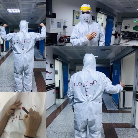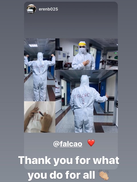 Korona virüsü ile mücadele kapsamında Erzurum’da bir sağlık çalışanı, giydiği özel tulumun arkasında Galatasaray’ın Kolombiyalı golcüsü Radamel Falcao’nun adını yazdı. Bu fotoğrafı gören Falcao da yanıtsız kalmadı. Yıldız futbolcu sosyal medya hesabından Eren adlı sağlık çalışanına cevap yazdı ve “Yaptıkların için teşekkür ederim Eren” dedi.
