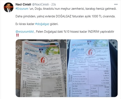Asgari ücretin yarısına denk gelecek şekilde gelen doğalgaz faturalarını sosyal medya hesabından paylaşan İYİ Parti Erzurum Milletvekili Naci Cinisli, “Erzurum’un, Doğu Anadolu’nun meşhur zemherisi, karakışı henüz gelmedi. Daha şimdiden, yalnız evlerde doğalgaz faturaları aylık 1000 TL civarında. Ev kirası kadar doğalgaz gideri” diyerek duruma tepki gösterdi.