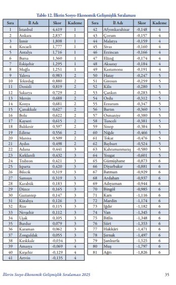 SEGE-2025 verilerine göre Doğu Anadolu Bölgesi’nde Malatya (44), Erzincan (46) ve Elazığ (47) Erzurum’un önünde yer aldı. Erzurum’un ardından bölgeden Tunceli 58, Ardahan 68, Bingöl 70, Kars 71, Iğdır 73, Van 74, Bitlis 75, Hakkari 77, Muş 80 ve Ağrı 81’inci sırada yer aldı. Raporda ayrıca Erzurum’un da aralarında bulunduğu beşinci gelişmişlik kademesinde 14 ilin bulunduğu, bu grubun başında Hatay’ın yer aldığı belirtildi.