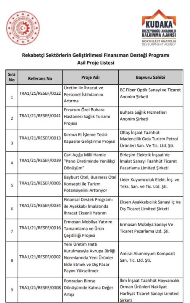 Erzurum/zirve2000 Kuzeydoğu Anadolu Kalkınma Ajansı (KUDAKA) tarafından 6 Nisan 2021 tarihinde ilan edilen “Rekabetçi Sektörlerin Geliştirilmesi Finansman Desteği Programı” kapsamında sunulan projelerin değerlendirme sonuçları bugün Bayburt’ta gerçekleştirilen 136. Yönetim Kurulu toplantısında onaylandı.